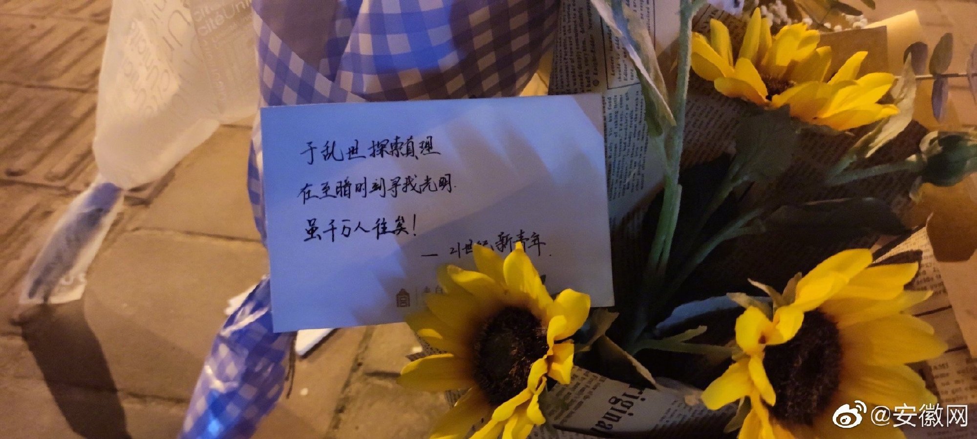 6月30日,合肥市民自发在延乔路路牌下祭奠鲜花。卡片上写着:于乱世探索真理,在至暗时刻寻找光明,虽千万人往矣。这盛世,如你们所愿。在青年烈士陈延年、陈乔年的老家安徽,合肥有一条路叫“延乔路”,路名正是为了纪念他们,而延乔路通往的是繁华大道。