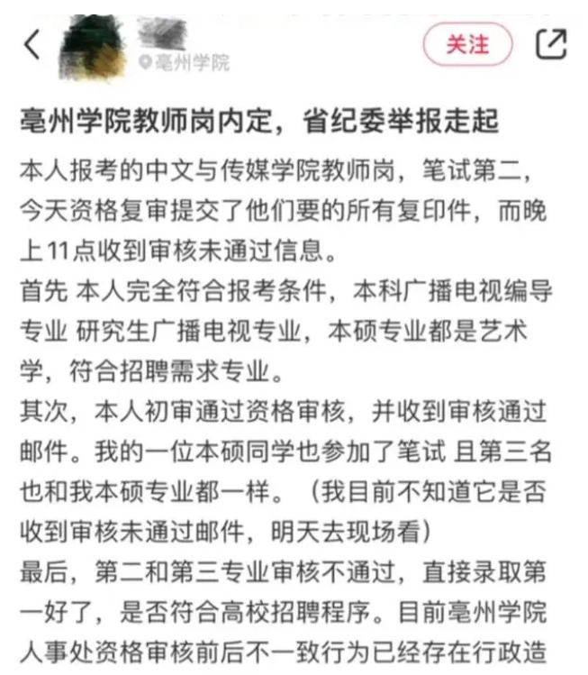 4月22日,安徽亳州一女子发文称,自己报考亳州学院中文与传媒学院的教师岗,笔试成绩第二名,可亳州学院却以专业不符合取消其面试资格,不让其参加面试。