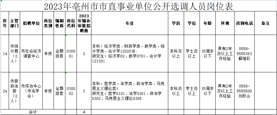 选调单位咨询电话:详见《2023年度亳州市市直事业单位公开选调人员岗位表》
