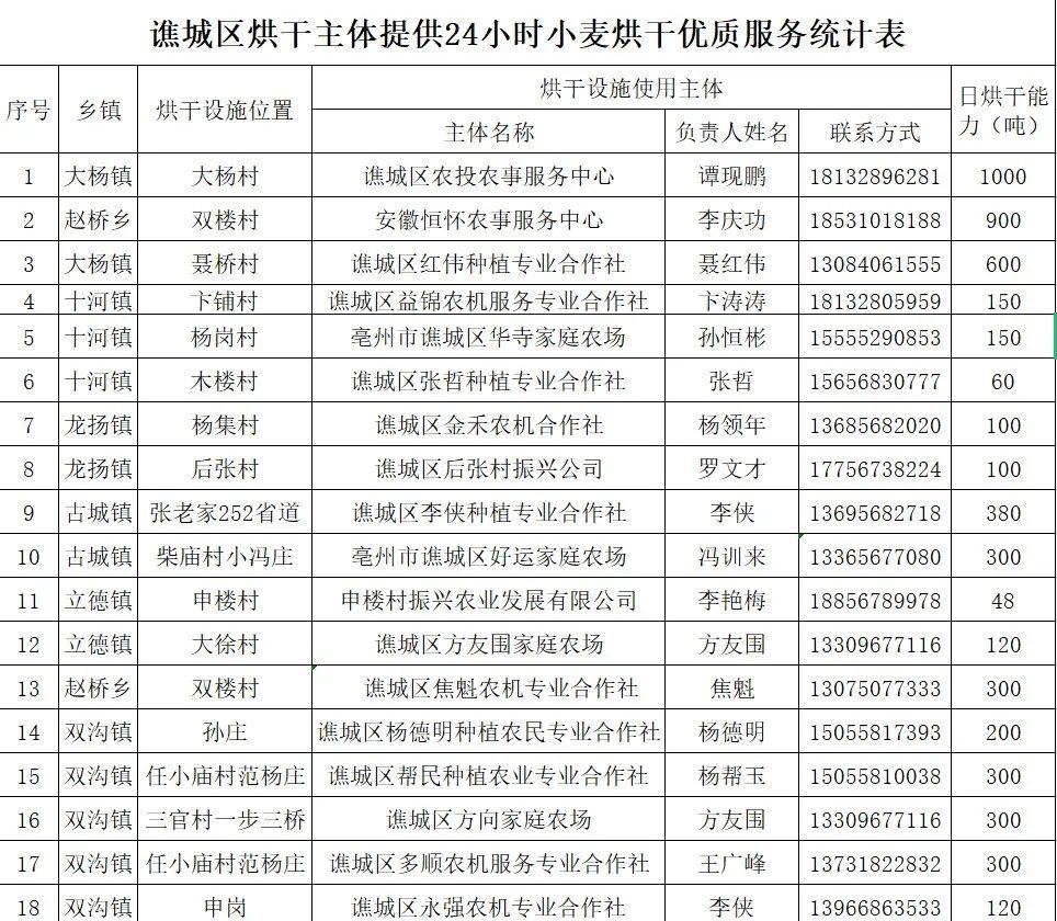 当前正值小麦抢收关键时期,为了更好的保障粮食产后服务,确保颗粒归仓,保证小麦的安全储存。谯城区农业农村局整理了对外开放的18家烘干设施主体,其中谯城区农投农事服务中心、安徽恒怀农事服务中心、谯城区聂红伟种植专业合作社等大型粮食烘干中心以成本价为广大粮农服务。如您有粮食烘干的需要,请及时与企业负责人联系。