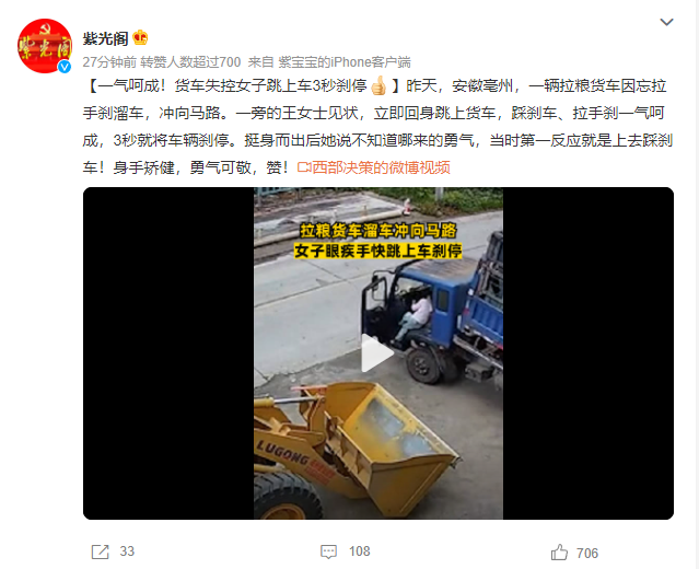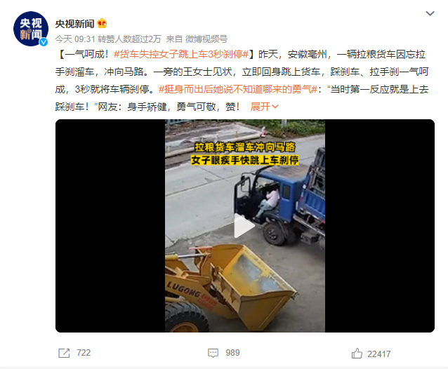 7月20日,安徽亳州。一辆货车突然溜车冲向马路,女子眼疾手快5步冲刺上车将大货车刹停,引发网友点赞。当事人王女士表示,这辆拉粮食的车没拉手刹,有个坡度导致溜车,她看到后跳到车上把车刹停,车主在后面拉着,只见这姐们儿一个箭步跳上车,第一时间把车刹住。