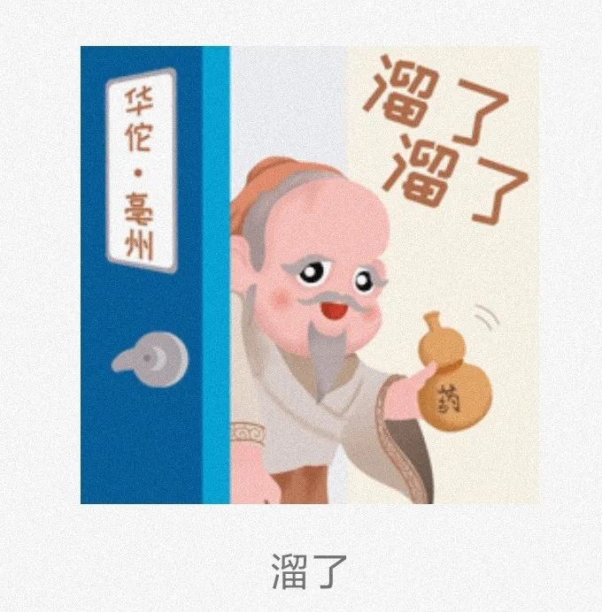 这套表情包结合华佗形象共设计了16个动态表情,内容涵盖日常用语、健康提醒等多个类别。不仅有常用的语气词“加油”“点赞”,还有“撸起袖子加油干”“干饭人”“溜了溜了”等网络流行语和传达了“养生亳州”历史文化理念的“早睡早起”表情包。