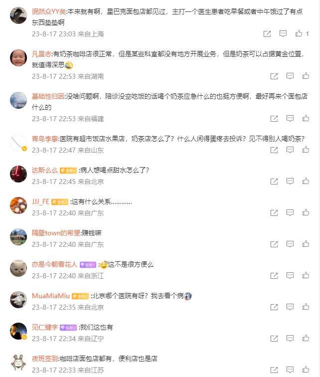 对于此事,网友们的评论也是不尽相同,从人数来看,支持者明显占上风。反对者认为在医院开奶茶店“不伦不类”。