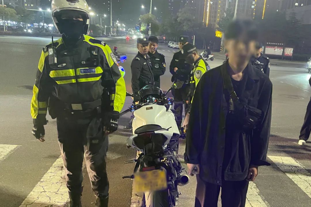 4月1日22时许,铁骑中队巡逻至嵇康路与养生大道交汇处时,发现一辆摩托车在行驶过程中发出刺耳的炸街声,于是上前将其拦截。经现场核查,该车排气系统进行过改装,一踩油门就会发出刺耳的轰鸣声。