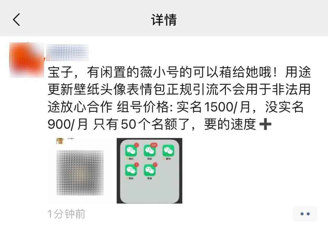 近期,我们发现有部分用户利用微信社交功能,在朋友圈、微信群发布“闲置小号换零花钱”等租售微信账号的相关内容。