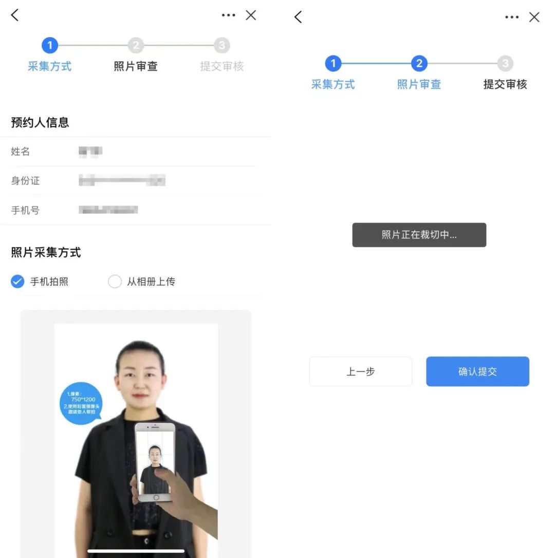 选择采集制证照片,阅读办理须知后,点击“照片采集”。填写相关信息后,选择照片采集方式,等待照片审查完成后,提交审核。