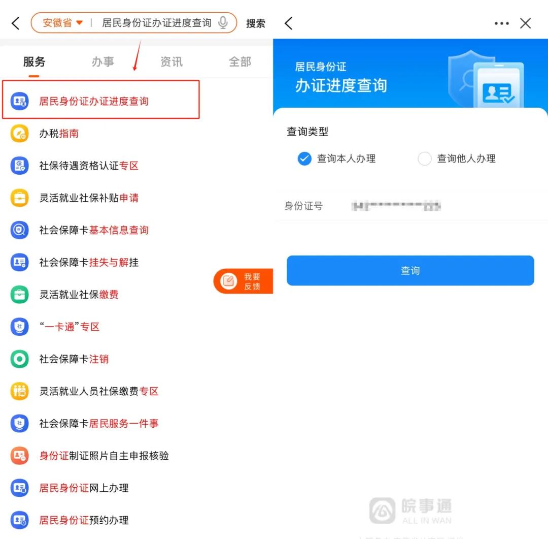 信息提交审核后,在首页搜索“居民身份证办证进度查询”,可查询本人或他人身份证办理进度。