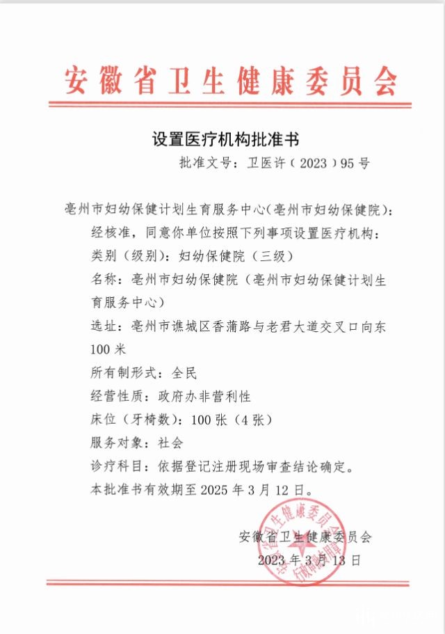 亳州市妇幼保健计划生育服务中心(亳州市妇幼保健院)三级妇幼保健院获批