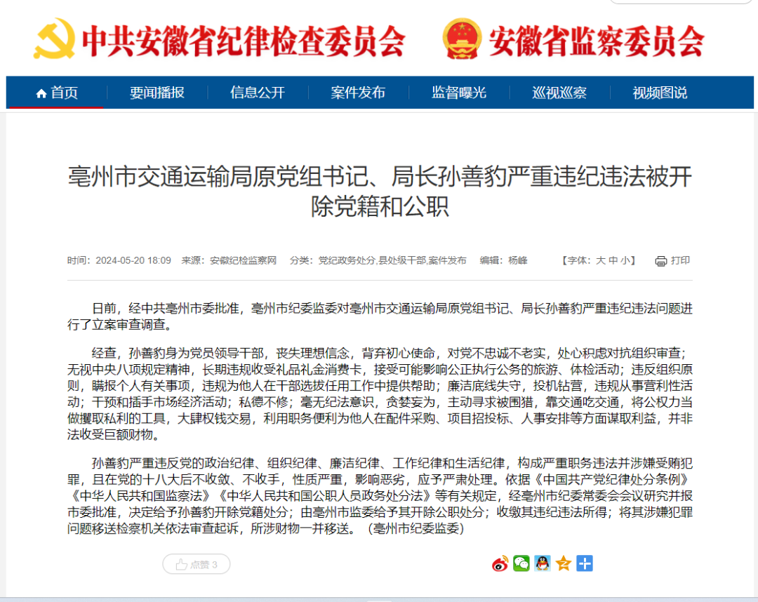 市交通运输局原党组书记、局长孙善豹严重违纪违法 被开除党籍和公职