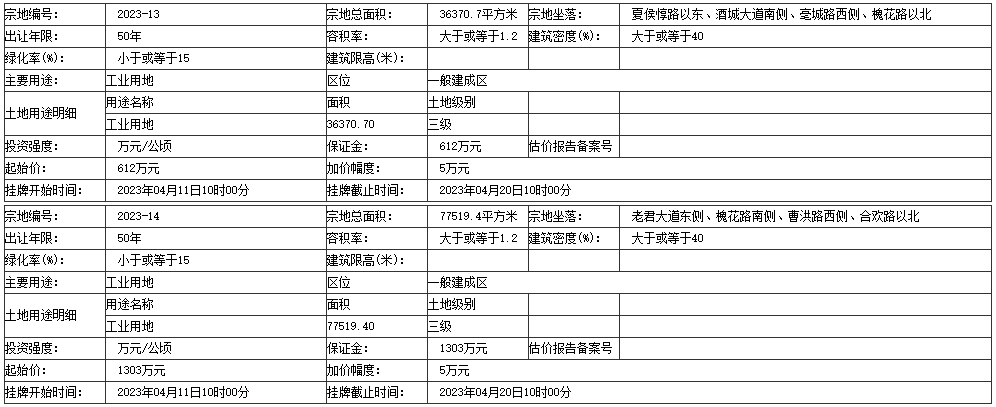 亳州市挂牌1宗工业用地,起始价418.0万元